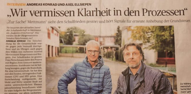 Sie bewerten den aktuellen Stand der Schullandschaft in Mettmann als „bodenlos ernüchternd“. Was werfen Sie der Bürgermeisterin Sandra Pietschmann vor? A. Konrad:Die Entscheidung für die Gesamtschule wurde gegen jede Vernunft durchgeboxt und im Übrigen auch gegen den Willen von mehreren tausend Mettmanner Bürgerinnen und Bürgern. Der Schulfrieden ist gestört. Frau Pietschmann hätte den Prozess…