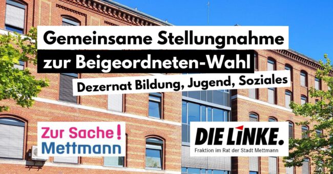 Die Ratsmitglieder Andrè Bär,Rainer Dittel,Axel Ellsiepen,Jürgen Gutt und Andreas Konrad von den Fraktionen „DIE LINKE.“ und „Zur Sache Mettmann“ haben an der Wahl zum Beigeordneten für Bildung,Jugend und Soziales während der gestrigen Ratssitzung nicht teilgenommen. Bereits zu Beginn des öffentlichen Teils der Ratssitzung hatte Andre Bär im Namen der fünf Ratsmitglieder…
